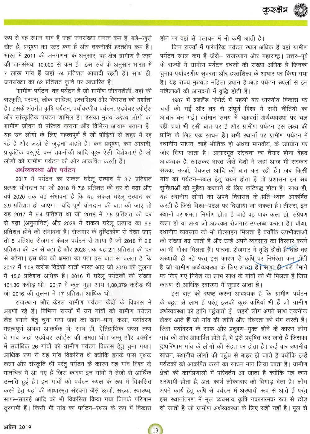 कुरुक्षेत्र : ग्रामीण भारत में इको पर्यटन (27-04-2019)