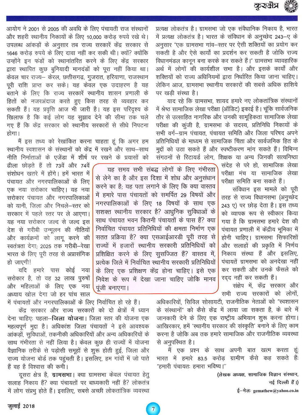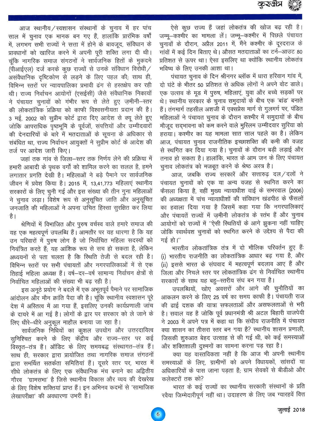 कुरुक्षेत्र : पंचायती राज : उपलब्धियां और चुनौतियां (21-07-2018)