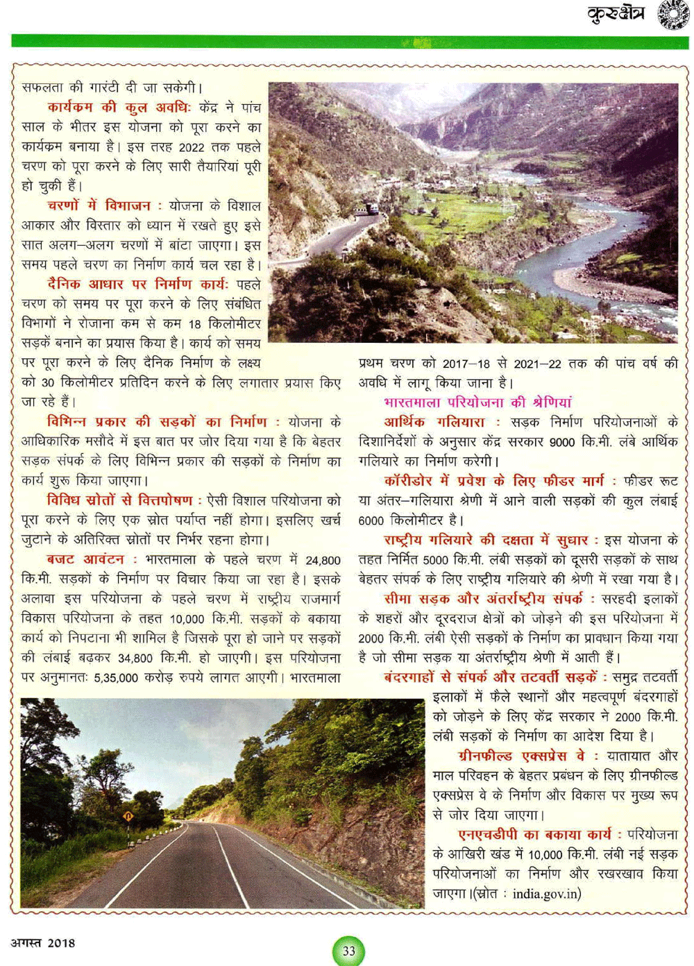 कुरुक्षेत्र : भारतमाला परियोजना : ‘न्यू इंडिया’ की दिशा में बढ़ते कदम (18-08-2018)