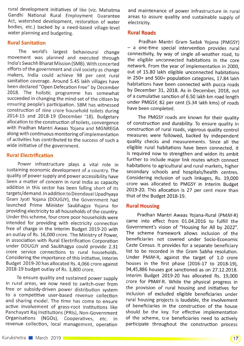 Kurukshetra : Infrastructure For Rural Transformation (16-03-2019)