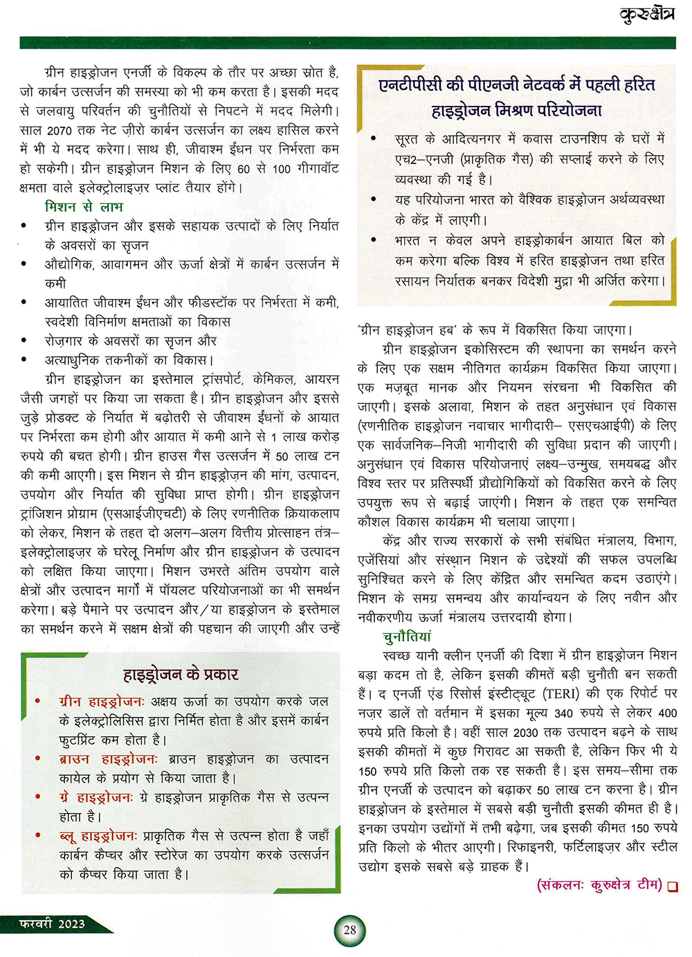 कुरुक्षेत्र : राष्ट्रीय ग्रीन हाइड्रोजन मिशन