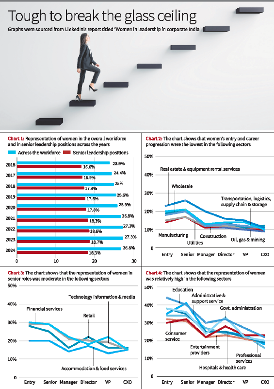 The stagnation in the share of women in senior positions and the dip in January this year can be attributed to the slowdown in fresh hires of women for leadership roles, data show. The share increased from 18.8% in 2016 to 25.2% in 2021 and declined after that. “LinkedIn Economic Graph data shows that despite progress, women still face obstacles in reaching leadership roles due to bias, societal norms, and structural barriers. However, recent focus on ‘women-led development’ has led to concerted efforts by both policymakers and business leaders to tackle these challenges,” said Aditi Jha, LinkedIn India Board Member and Country Head, Legal and Government Affairs.