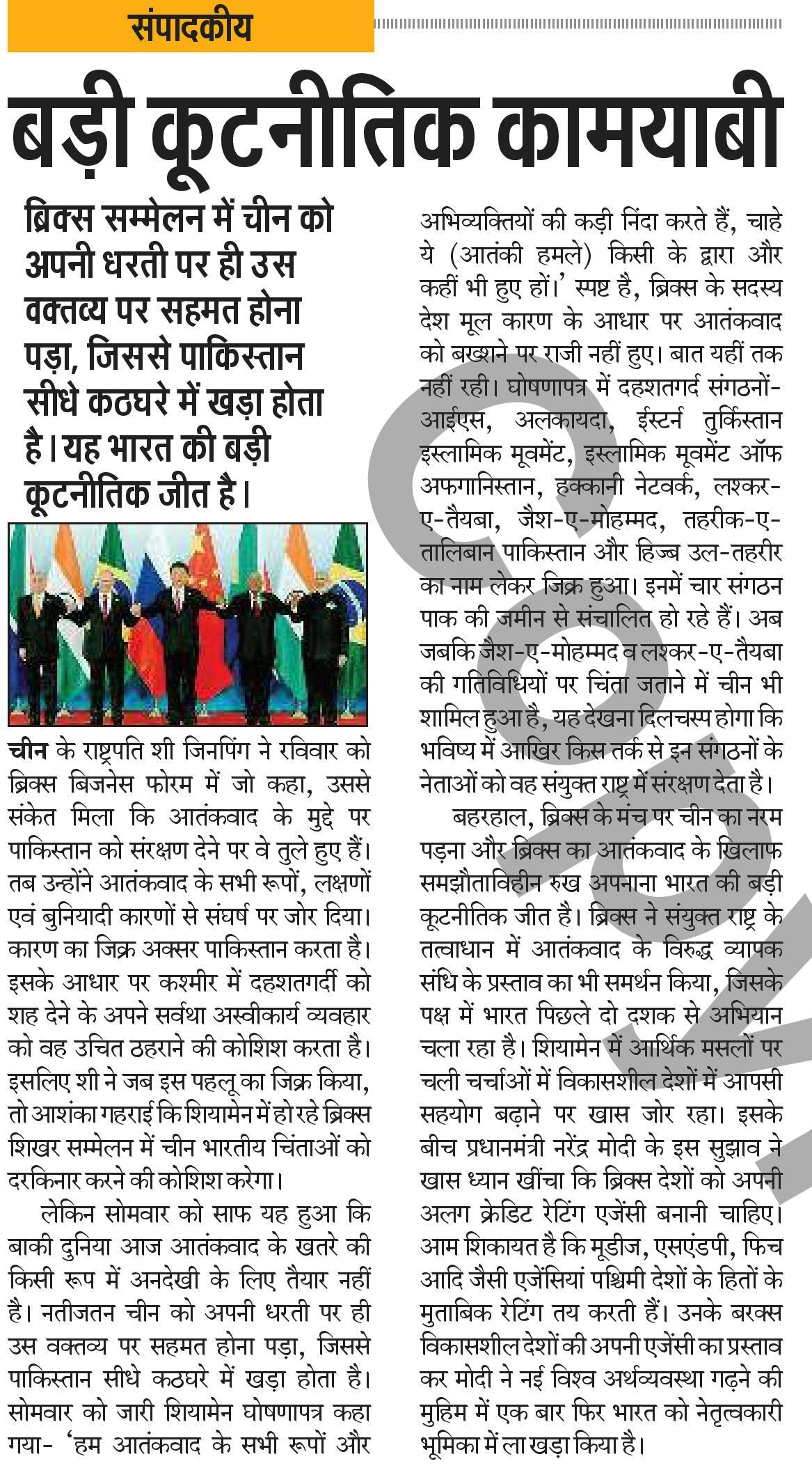 It would be wrong to see the declaration as a diplomatic ‘victory’ for India. Terror groups operating out of Pakistan share logistics, resources and ideology. Targeting just those which take aim at one’s own country while turning a blind eye to the others – in an exceedingly narrow definition of national interest – is self-defeating. Neither is it tenable to claim – as Islamabad often argues and Beijing reiterates – that Pakistan has made the most ‘sacrifices’ in fighting terror, as those are the inevitable consequences of selectively nurturing terror groups (in the end, such nurturing can never be selective). It is therefore in Pakistan’s own interest – and Beijing too should be nudging it towards this point of view as Islamabad’s trusted ally – to end such support.Following the Xiamen declaration New Delhi should renew its efforts to get Jaish chief Masood Azhar proscribed by the UN, and Beijing should drop its objections there. At the Brics summit and elsewhere Chinese President Xi Jinping has, correctly and commendably, spoken up for global cooperation. But that is not compatible with riding roughshod over Indian interests. Ultimately, China must realise that terrorism emanating from Pakistan harms everyone’s interests, including Chinese ones.