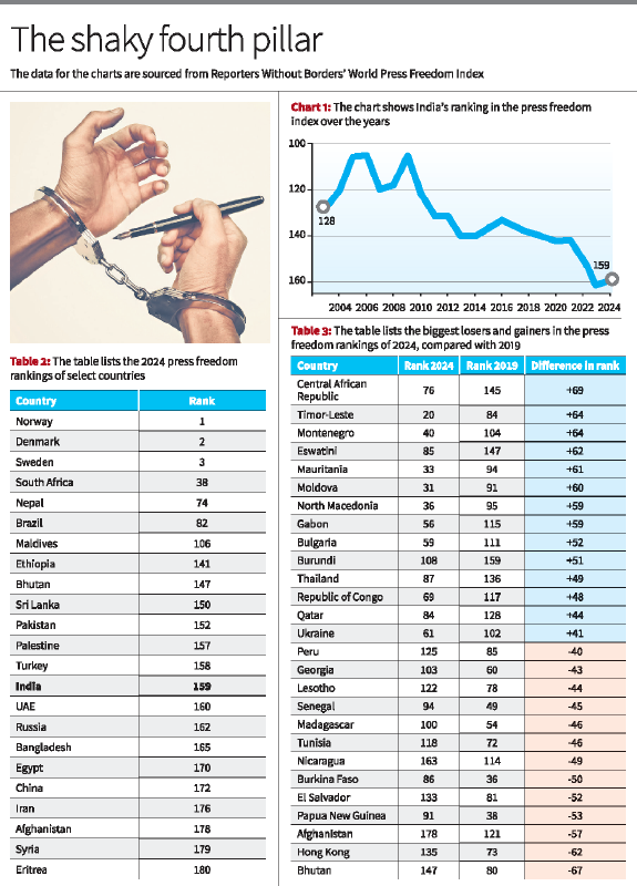 Table 2 shows the 2024 press freedom rankings of select countries. This year too, the Scandinavian countries — Norway, Denmark, and Sweden — were the best performers, while Eritrea, Syria, and Afghanistan were the worst. Among the BRICS countries (the old list), Brazil and South Africa enjoy greater press freedom than India, whereas China and Russia are ranked lower. Among South Asian nations, except Bangladesh, all the other countries rank better than India in the latest list.