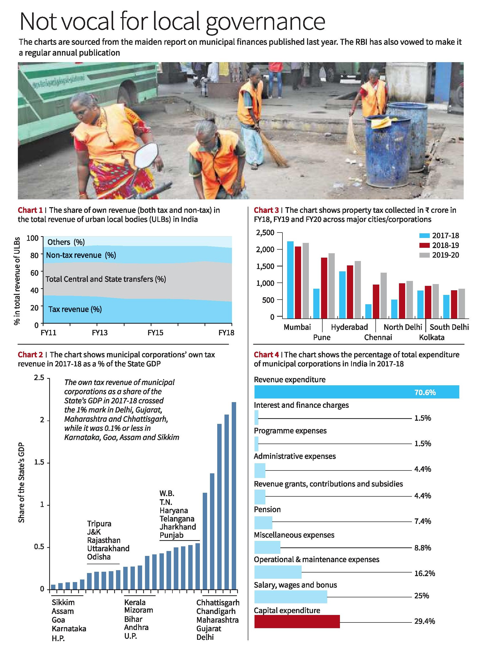 The corporations are mostly de pendent on transfers with their re venue raising potential being limit ed. Property taxes are not efficiently collected. The generated funds are mostly spent on rev nue expenditure, leaving a much smaller pie for capacity building.
