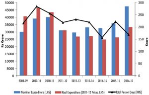 Since FY09, when the scheme had a pan India roll out, expenditure for MGNREGA has grown at an average of 7% per annum in nominal terms. But in real terms measured at 2011-12 prices (by using CPI-AL as deflator), it has actually been decreasing till FY15, and then improved marginally. Still, the budgeted expenditure in FY18 is roughly about 28% lower than the revised estimate of FY10 in real terms (see graph).