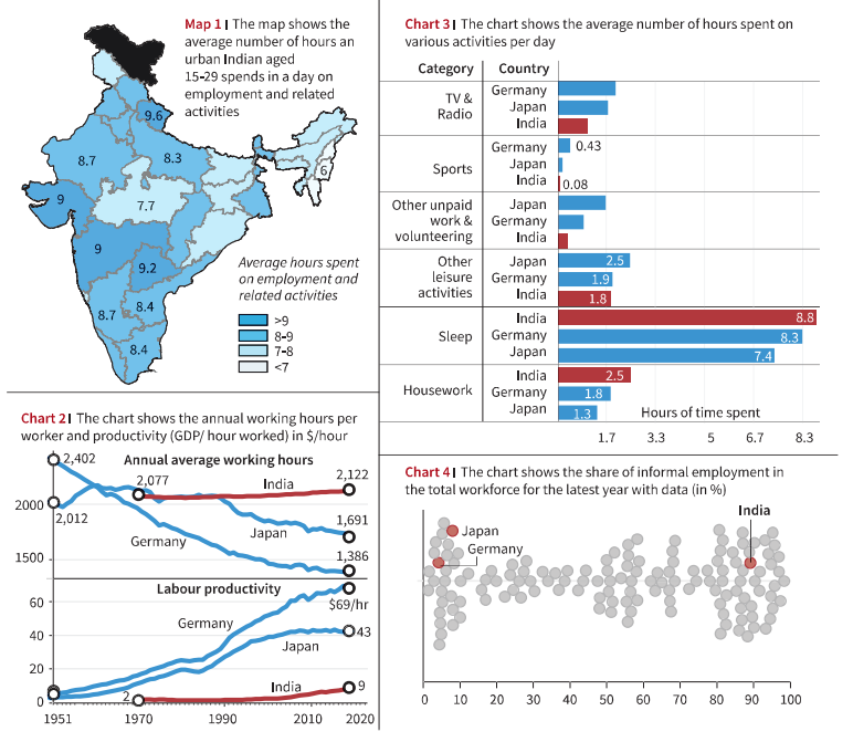 Assuming a six-day work week, Mr. Murthy’s comment means that Indians would have to work 11.5 hours a day. How many hours does an average young Indian work at present? According to the Time Use Survey conducted in India in 2019, a person aged 15-29 spends over 7.2 hours a day in employment and related activities in rural areas and 8.5 hours a day in urban areas. A State-wise comparison of the time spent on work in urban areas, given that this figure is higher than in rural areas, is presented in Map 1. Urban Uttarakhand ranks first, with young people from the State working for an average of 9.6 hours a day, which is about two hours less than what Mr. Murthy envisions.